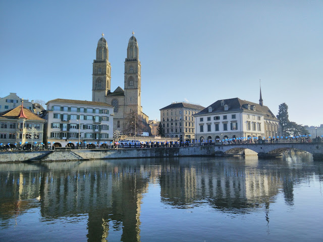No dia seguinte fomos passear até Zurique. Começamos por visitar a maior estação ferroviária da Suiça, a Zürich Hauptbahnhof. É nesta estação enorme que se encontra a árvore de Natal da Swarovski e um dos vários Mercados de Natal existentes na cidade. Ao lado da estação encontramos o Museu Nacional Suíço, o Landesmuseum Zurich é um dos principais museus de arte e história cultural da Europa. Depois de uma caminhada pela parte antiga da cidade, encontramos um dos símbolos mais famosos de Zurique, a igreja protestante Grossmünster. E na outra margem do rio Limmat pudemos ver a Fraumünster e a St. Peter's com o maior relógio de torre de igreja da europa. Subimos a colina de Lindenhof e observamos a vista privilegiada da cidade.